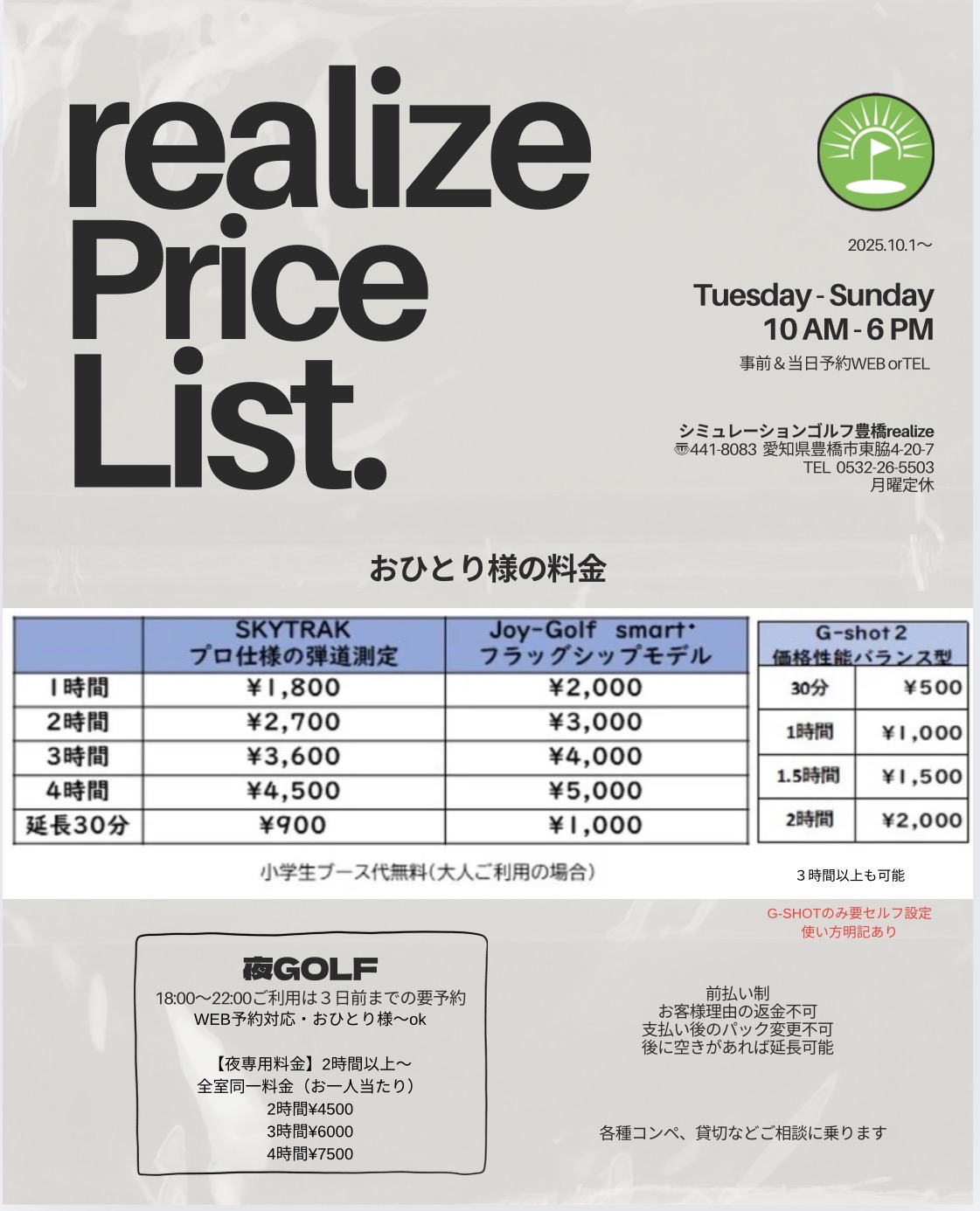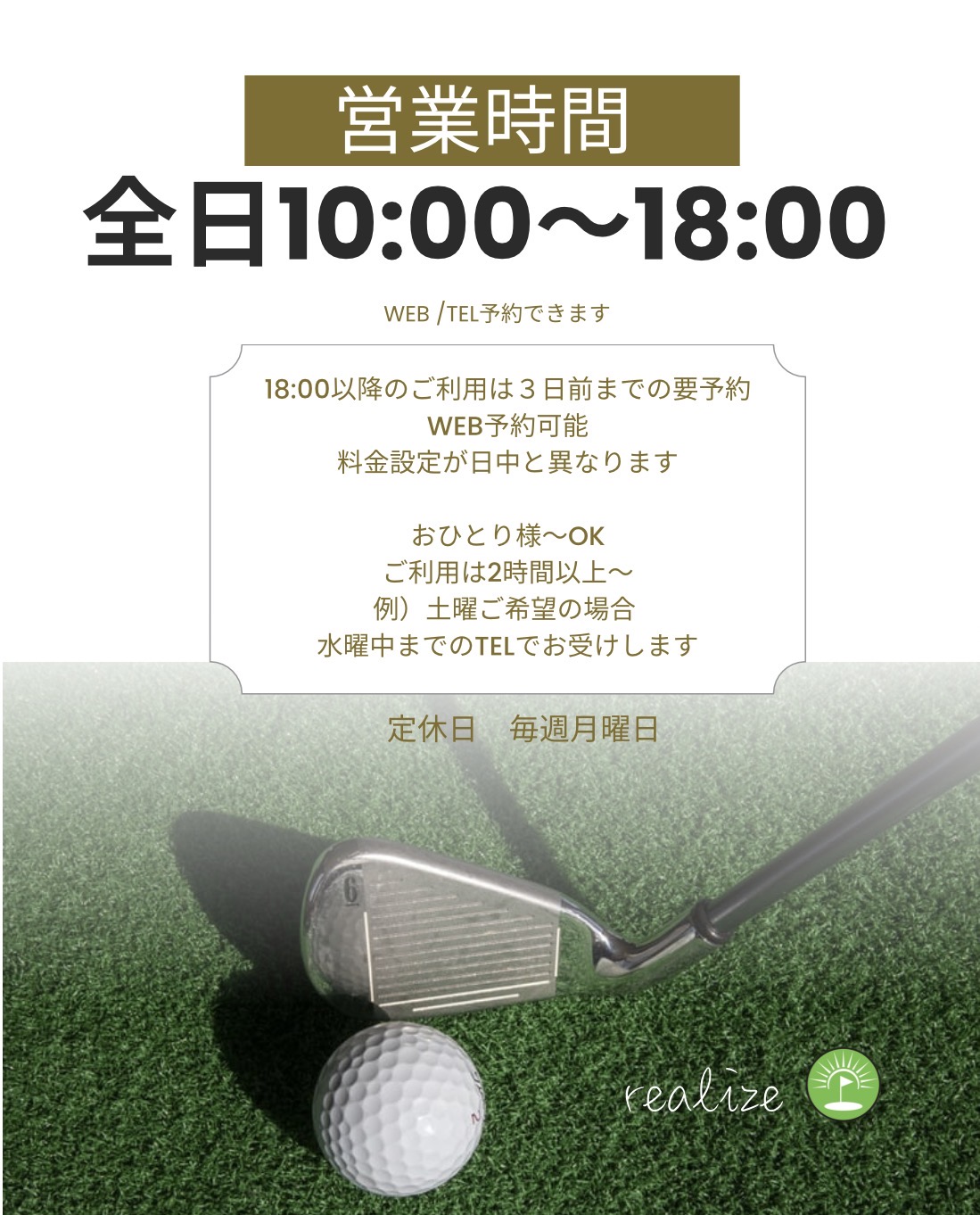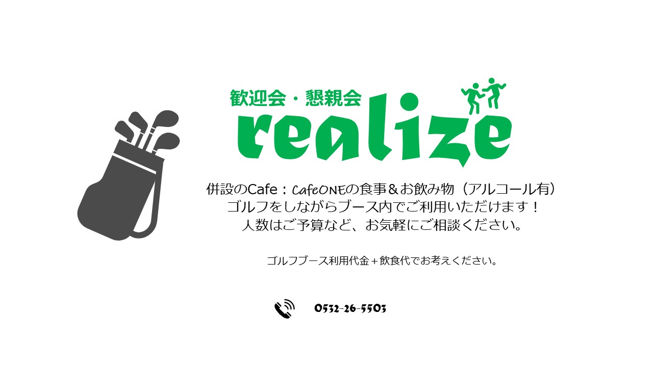 シミュレーションゴルフ豊橋realizeのホームページにお越しくださり誠にありがとうございます。realizeのシミュレーションゴルフなら、天候・時間に関係なく、手ぶらでご来店いただいてプレーすることが可能です。普段着のままでもプレーができます。